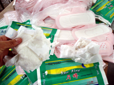 工商執法人員在檢查中,撕開一些已經包裝好的“高級衛生巾”一看,里面全是碾碎的干紙漿,令人觸目驚心。工商執法人員說,該加工點生產加工的“月婷”、“白牡丹”等女用“高級衛巾”均是冒用他人的廠名、廠址和衛生許可證號,又沒有衛生許可證,F場看到的衛生巾在包裝前沒有經過衛生消毒(現場沒有消毒設備),無疑會給使用者的健康帶來危害。