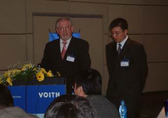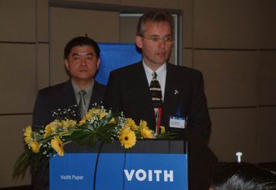 25日早上9點,“超越2004”客戶技術交流會正式開始,福伊特造紙技術中國區總裁劉明明女士首先致歡迎辭。劉明明說,幾十年前,VOITH就是業內被認為是第一流的設備供應商并建立了造紙技術的標準,并以其服務、技術實力和與眾不同的、專業化的項目管理而著稱。所有這些標準都是成功的造紙生產的基礎,但實現長期成功的、具有決定意義的關鍵詞卻是可靠性!邀請各位出席這次交流會,福伊特將向各位提供VOITH的信息、技術以及全面的服務。我們確信只有從漿料制備到造紙設備以及整飾和包裝的完美工藝技術才對高效率的生產工藝具有重要作用。為此邀請大家聽一聽演講,并提出問題,共同進行深入的討論和對話。