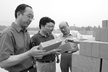 位于鎮江新區的盛華粉煤灰利用開發有限公司幾經探索,最終使用了國內一家高校的先進技術,投資1500萬元在金東紙業旁,建起了一座制磚廠,原料全部使用金東的粉煤灰、石灰渣、大理石渣等固體廢棄物。這種磚拎在手上,比普通黏土磚略重,外表無一絲氣泡和縫隙。通過省級評估后,來自省建設廳、東南大學以及鎮江墻體材料革新辦公室的專家們告訴記者,這種磚不同于普通電廠的粉煤灰磚,后者強度不高只能用于非承重墻,而這種磚完全可以用作承重墻,其強度高于黏土磚一倍以上,更奇特的是,隨著使用時間的推移,其強度還能繼續加大,這是由于它具有高碳高鈣的“氣硬性”(即遇空氣后變硬的特性,正如水泥具有“水硬性”)決定的,它良好的外光潔度和色澤還可以省去外立面的涂料和裝飾費用。專家們表示,這一技術的運用填補了省內空白(見圖張斌譚石虎攝)。