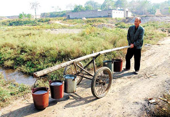 在村北,記者看見村民楊北鎖正在用簡易的架子車往家送水。記者得知,現(xiàn)在他們隊的居民生活用水不得不靠村南的自來水供應,以前吃水不掏錢,現(xiàn)在每人每月得掏1.5元錢的水費。