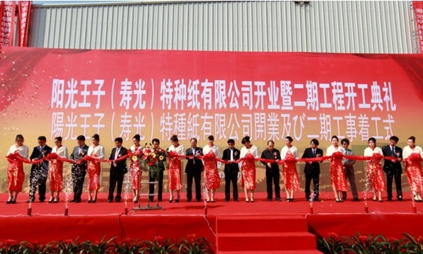 10月18日,陽光王子開業(yè)暨二期工程開工典禮在陽光王子(壽光)特種紙有限公司隆重舉行。來自壽光市黨政機關(guān)的有關(guān)領(lǐng)導(dǎo),王子控股株式會社、全國各地的客戶朋友以及世紀(jì)陽光集團的干部員工共300多人出席了慶典儀式,集團公司董事長王東興介紹了陽光王子組建及發(fā)展中的有關(guān)情況,提出建設(shè)二、三期工程,形成年產(chǎn)特種紙15萬噸、打造中國特種紙第一品牌的宏偉目標(biāo)。有關(guān)領(lǐng)導(dǎo)為公司開業(yè)剪彩、為二期工程開工奠基。