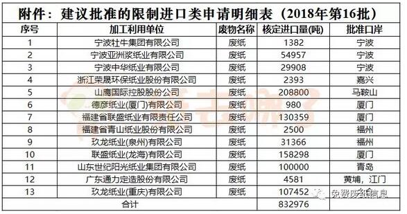 7月16日,環保部固體廢物與化學品管理技術中心公示了2018年第16批限制進口類產品明細,共有13家造紙企業獲批,總核定量為83.2976噸。