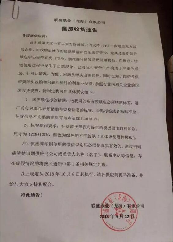 福建漳州聯盛紙業(龍海)有限公司,國廢收貨通告。