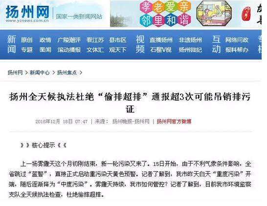重污染天氣來襲,揚州永豐余主動減產50%,1臺鍋爐停產 從15日17時開始,江蘇省范圍內再度“亮”起大氣重污染天黃警。究竟揚州市情況如何?記者12月17日跟隨市環境監察支隊工作人員上路,“目前全天候執法檢查,杜絕超排、偷排現象。” “因天氣霧霾原因,我們1號爐已處于停止狀態。”17日,永豐余造紙(揚州)有限公司工作人員介紹。據悉,永豐余是全省首批秋冬季錯峰生產及重污染天氣應急管控停限產豁免企業,重污染天氣應急管控按10%比例限產。但盡管是豁免企業,該單位還是在自我“加壓”,主動減半產能。“目前是把一臺鍋爐停掉,保證50%的產能減少排放。”永豐余造紙(揚州)有限公司氣電主任繆建科介紹。 全天候執法杜絕“偷排超排”,通報超3次可能吊銷排污證 據悉,近一段時間以來,揚州市環境監察支隊通過加密檢查頻次、組織夜查等形式,全天候、不定期、不定時地進行檢查,確保各項預警級別管控措施落實到位。據了解,12月以來,市環境監察支隊現場科共檢查企業50廠次左右,發現10家企業共計11個環境問題,其中9個問題已整改到位,兩個問題已制訂整改方案。“個別企業可能存在堆場沒有完全覆蓋的情況,我們也要求其進行整改。” 市環境監察支隊市開發區片區負責人陳國告訴記者,“第二天我們還會到現場進行復查,通報達到3次以上的(企業)可能就要吊銷排污許可證。”