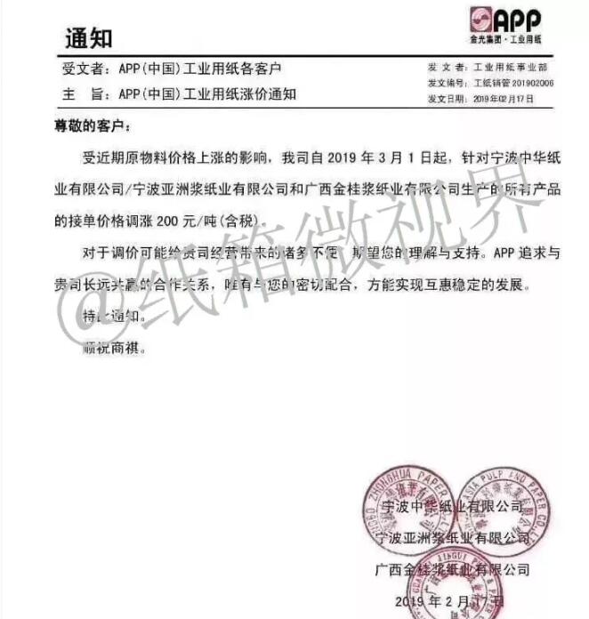 在漲價的背后,紙企的業(yè)績情況并不理想。 其中,博匯紙業(yè)預(yù)計2018年度實現(xiàn)歸屬于上市公司股東的凈利潤同比減少67.29%。而利潤下滑的主要原因,是原材料價格上升及產(chǎn)品的售價下降所致。 “現(xiàn)在的價格上調(diào)并不是供不應(yīng)求,而是紙業(yè)市場因環(huán)保及原料等原因?qū)е吕麧櫩臻g進一步縮減,各大紙業(yè)只能提價保利潤。”一家上市紙企的高管在接受采訪時表示,原紙價格上漲傳播到下游紙板廠,而紙板廠議價能力偏弱,只能被動提價。 未來紙企或許會把業(yè)務(wù)延伸到下游紙板廠,完善產(chǎn)業(yè)鏈以提高利潤。 原材料推動紙價上漲,原紙價格全線上調(diào),陸續(xù)會有更多廠家跟漲 2月17日,APP(中國)工業(yè)用紙公司率先發(fā)布漲價函,隨后2月18日,晨鳴紙業(yè)、博匯紙業(yè)等紙企也紛紛跟漲,漲價幅度均為200元/噸。