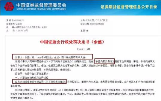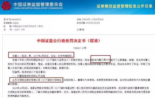 日前,證監(jiān)會公布三張行政處罰決定書,余盛、程凌、吳學(xué)軍各領(lǐng)一張。三人均因利用內(nèi)幕信息交易“太陽紙業(yè)”被處罰,分別被證監(jiān)會“沒一罰一”。其中,余盛被罰沒1225.33萬元,程凌被罰沒73.07萬元。吳學(xué)軍除自己內(nèi)幕交易外還建議他人買賣內(nèi)幕信息所涉股票,合計(jì)遭罰沒金額達(dá)2268.38萬元。整體來看,三人共被罰沒3566.78萬元。 值得一提的是,三宗“太陽紙業(yè)”內(nèi)幕交易案涉及的兩位“泄密者”為清華大學(xué)同學(xué)。 三人因內(nèi)幕交易,“太陽紙業(yè)”分別被“沒一罰一” 中國證監(jiān)會官網(wǎng)日前公布三張罰單,分別指向三位被處罰者。盡管三張罰單涉及三宗案件,但當(dāng)事人知悉的內(nèi)幕信息相同,內(nèi)幕交易的股票同為“太陽紙業(yè)”。