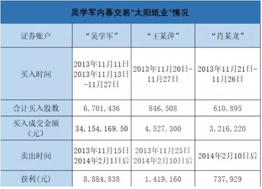另一位被處罰者吳學(xué)軍控制其本人及“王某萍”“肖某龍”賬戶,在內(nèi)幕信息敏感期內(nèi)買入“太陽紙業(yè)”791.06萬股,賣出5.83萬股,吳學(xué)軍賬戶組盈利1104.19萬元,被證監(jiān)會“沒一罰一”罰沒2208.38萬元。
