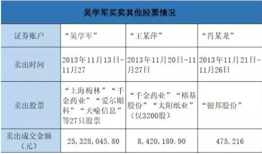 此外,“太陽紙業(yè)”買入金額占同期賬戶可使用資金總額比例較大。“余盛”賬戶買入金額占比99.9%,“星月投資”賬戶買入金額占比99.89%,“周某英”賬戶買金額占比9.57%。 與余盛類似,吳學(xué)軍賬戶組自開戶以來未交易過“太陽紙業(yè)”。與朱某、單某軍第一次見面后,吳學(xué)軍從2013年11月13日至11月26日大量買入“太陽紙業(yè)”共755.08萬股,成交金額3876.5萬元,僅賣出5.83萬股,成交金額29.8萬元5.83萬股,成交金額29.8萬元。 11月26日吳學(xué)軍與朱某、單某軍第二次見面后,11月27日,吳學(xué)軍操作王某萍及其本人賬戶又買入“太陽紙業(yè)”35.98萬股,買入金額194.58萬元。吳學(xué)軍賬戶組于2013年11月13日至11月27日合計(jì)買入“太陽紙業(yè)”的成交金額,占吳學(xué)軍賬戶組“太陽紙業(yè)”總買入量的92.39%。 在內(nèi)幕信息公開前,吳學(xué)軍賬戶組于2013年11月13日至12月11日(復(fù)牌日)僅賣出5.83萬股,金額29.8萬元,其他均是在內(nèi)幕信息公開后賣出。 吳學(xué)軍賬戶組買入“太陽紙業(yè)”相比其他股票的金額放大。與朱某、單某軍接觸后,從2013年11月13日至11月27日,吳學(xué)軍賬戶組買入“太陽紙業(yè)”791.06萬股,合計(jì)4071.08萬元,是該時(shí)期吳學(xué)軍賬戶組買入金額最大的股票。 除在買入金額中占比較大外,“太陽紙業(yè)”買入金額占同期賬戶可使用資金總額比例也較大。吳學(xué)軍賬戶組買入“太陽紙業(yè)”金額占同期賬戶可使用資金金額的79.23%。 值得一提的是,吳學(xué)軍賬戶組也出現(xiàn)賣出其他股票買入“太陽紙業(yè)”的異常情況。