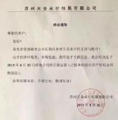 行情不好,生意難做。在4月份的最后一天,江蘇省蘇州市某包裝公司發布停業通知稱,由于經濟環境差,市場低迷,公司處于虧損狀態,只好結束正常運營。