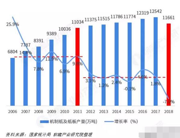 2006-2018年中國機制紙及紙板(外購原紙加工除外)的產量及其增長情況