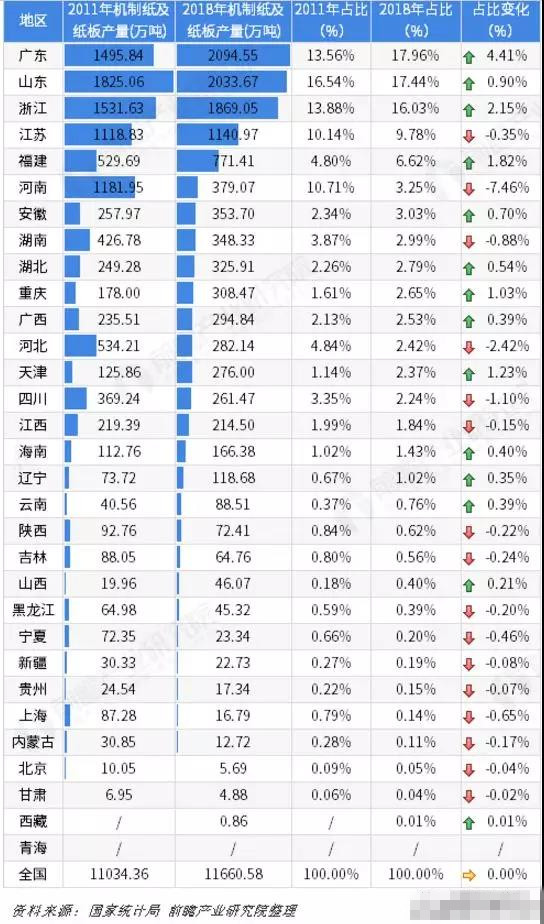2011年和2018年中國各省市機制紙及紙板(外購原紙加工除外)產量對比