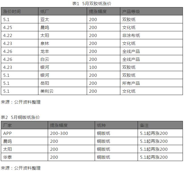 進(jìn)入2019年,文化紙的表現(xiàn)一直堅(jiān)挺。從1月開始文化紙就進(jìn)入新一輪提價(jià)周期,進(jìn)入1~2月紙廠發(fā)布兩輪漲價(jià),價(jià)格在第一季度基本上都得到較好落實(shí),4月份整體市場仍屬偏暖行情,文化紙繼續(xù)推漲,接單也基本順暢,從春節(jié)后400~500元/噸的漲幅基本也是確定了一輪反彈基調(diào),5月延續(xù)漲價(jià)熱潮。如表1、表2。