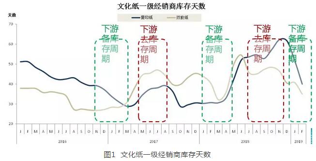 需求回升,進(jìn)入新一輪備庫周期 1、傳統(tǒng)旺季來臨 傳統(tǒng)出版旺季到來,3月~4月招標(biāo)全面開始,4月~6月印廠開始會(huì)陸續(xù)啟動(dòng)進(jìn)貨流程,教材用紙消化掉紙廠的很大一部分產(chǎn)能,短期內(nèi)市場供應(yīng)量有限,因此市場具備有漲價(jià)的可能性。 2、渠道庫存消化殆盡 經(jīng)過2018年底的一輪調(diào)整,目前渠道商和終端用戶的庫存已經(jīng)消化殆盡,下游去庫存的周期基本完成,將進(jìn)入新一輪的備庫周期,存在補(bǔ)庫的剛性需求,同時(shí)紙廠也需要漲價(jià)彌補(bǔ)產(chǎn)能不足造成的損失。如圖1。