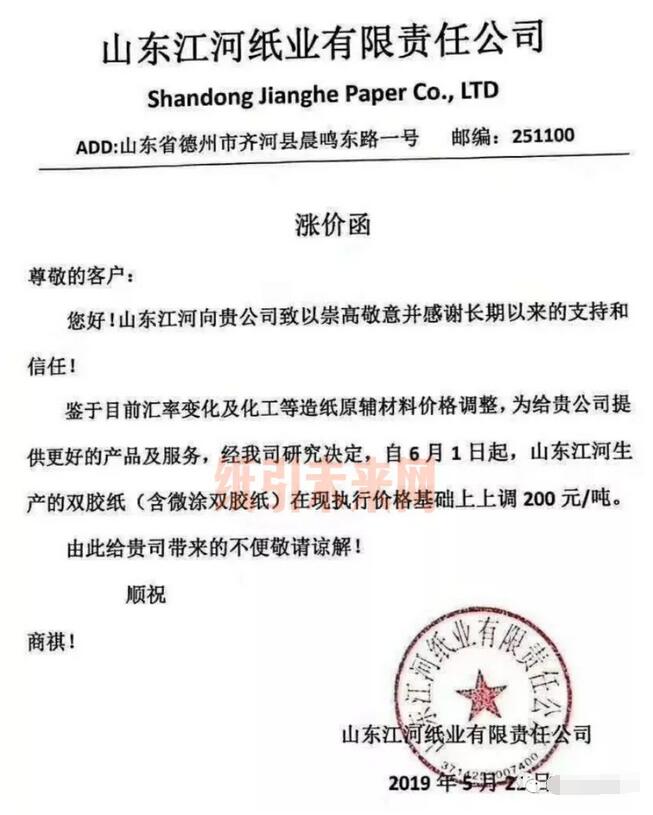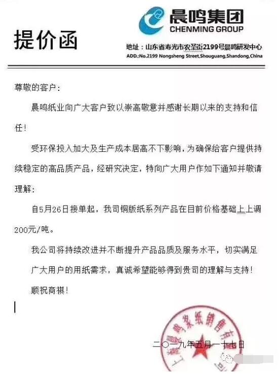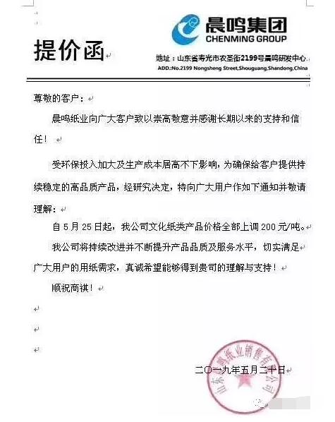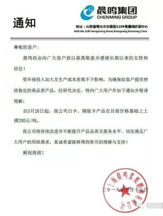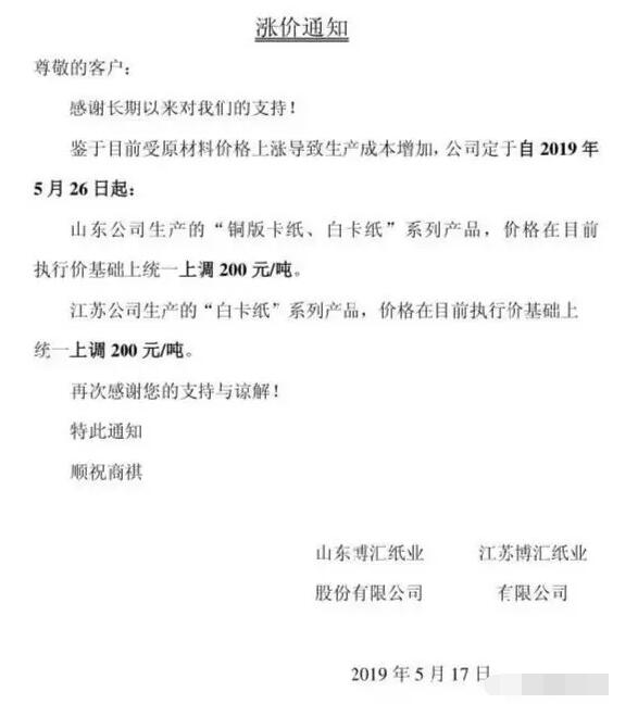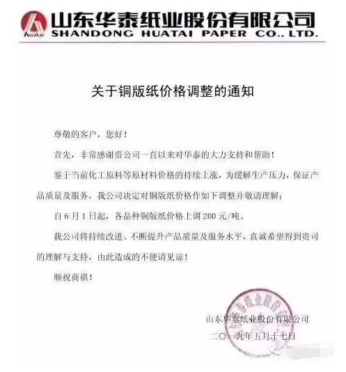 山東太陽紙業(yè)股份有限公司:經過對原材料市場趨勢分析,以及基于對成品市場未來一段時間供需關系及哭殘現狀的判斷,對太陽紙業(yè)生產并在國內市場銷售的產品價格做如下調整:1、普通類涂布紙在目前的執(zhí)行價格基礎上,上調200元/噸。2、普通類膠版紙在目前的執(zhí)行價格基礎上,上調200元/噸。以上價格調整,自2019年6月1日起執(zhí)行。