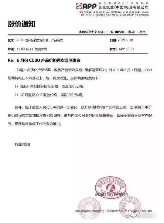 APP:為進一步優(yōu)化產品結構,改善產銷指標,自2019年6月1日起,CCBU紙種價格在5月基礎上,統一再次調漲,具體調整幅度如下:1)GE&JH各品牌銅版紙價格,調漲200元/噸;2)GE雙膠紙及GHS雙膠紙價格,調漲200元/噸。