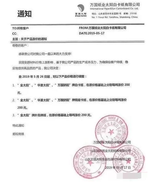 萬國紙業(yè)太陽白卡紙有限公司:近期因受到原材料就愛個上漲與鑒于后續(xù)人民幣匯率變化影響,自2019年6月1日起,針對萬國紙業(yè)太陽白卡紙有限公司生產以下食品類產品就愛個進行調整:“華夏太陽”牌淋膜系列原紙,在5月份價格基礎上上調200元/噸。