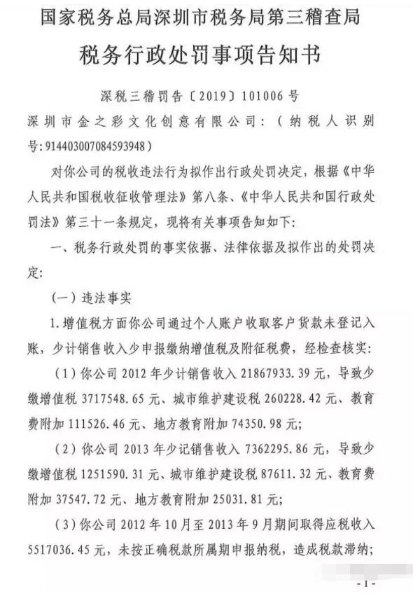 6月18日,美盈森發布公告稱,其控股子公司深圳市金之彩文化創意有限公司因在增值稅、營業稅、個人所得稅等方面存在偷稅行為,于2019年6月17日收到國家稅務總局深圳市稅務局第三稽查局簽發的深稅三稽罰告。 根據《稅務行政處罰事項告知書》顯示,深圳市金之彩文化創意有限公司在2012年、2013年期間,少繳稅款1200多萬。其違法行為須處以少繳稅款的百分之五十罰款,因此罰款金額高達六百多萬。且滯納金還未算入統計。 美盈森在公告中表示,深圳金之彩上述稅務違法行為主要發生在于2013年10月收購深圳金之彩70%股權之前,歐陽宣系時任董事長、法定代表人及大股東;且在稅務違法行為發生的所有期間,深圳金之彩均由歐陽宣擔任董事長、法定代表人及實際經營管理者。 換而言之,造成如今這個須追繳稅款1200多萬,繳納罰款600多萬的局面,是深圳市金之彩文化創意有限公司被收購70%股權前的違法行為而導致的結果,而美盈森則是一個受害者。 一、違法事實