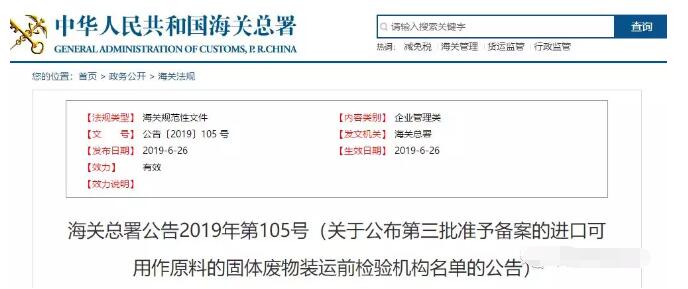 造紙企業(yè)注意了!6月26日,海關(guān)總署公布了第三批準予備案的進口可用作原料的固體廢物裝運前檢驗機構(gòu)名單。