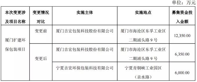 (二)本次部分募投項目變更實施主體和實施地點的原因:寧夏地處黃河經濟帶的核心地區,是我國建設內陸開放型經濟試驗區的重要一級,也是新絲綢之路經濟帶上的一個重要節點。由于寧夏地區具有得天獨厚優越的地理位置與資源優勢、良好的生產條件以及相比內地經濟運行成本低廉等特點,吸引了大批食品飲料、奶制品、啤酒等快消品行業的企業巨頭在寧夏投資設立生產基地,該地區包裝需求持續快速增長。 公司本次部分變更募投項目在寧夏地區實施,可就近為戰略合作客戶位于寧夏的工廠提供更為優質、高效、便捷的供貨服務,有效降低用工及物流運輸成本, 同時緊跟客戶擴張步伐,在滿足客戶需求不斷提升的同時,進一步擴大銷售規模, 提升公司經營業績。 三、本次擬部分變更募投項目實施主體和實施地點對公司的影響 1、本次部分募投項目變更實施主體和實施地點是結合募投項目的實際建設情況,符合公司戰略規劃安排,有利于公司募投項目更好的實施,有利于公司長遠發展,符合公司及全體股東的利益。 2、本次募投項目變更實施主體和實施地點后,可填補公司包裝業務生產基地在西北地區的區域空白,完善包裝業務的基地布局。同時,公司可運用多年積累成熟的建廠經驗、包裝生產技術及運營管理經驗,在為戰略合作客戶提供服務的同時,利用服務品牌客戶的影響力逐漸輻射寧夏周邊地區潛在的包裝客戶,逐步開拓寧夏及周邊地區的客戶資源及包裝市場,進一步滿足公司產業擴張、實現長期戰略發展目標的需求。 3、除變更實施主體及實施地點外,公司募投項目建設背景、技術方案未發 生重大變化。變更后的實施主體為公司及其全資子公司,不會對項目實施產生不利影響,不存在變相改變募集資金投向和損害股東利益的情形。本次變更實施主體及實施地點有利于提高募集資金的使用效率,公司將加強募集資金使用的內部與外部監督,確保募集資金使用的合法、有效。 4、公司“廈門擴建環保包裝項目”實施主體寧夏吉宏環保包裝科技有限公 司及其實施項目已取得發展和改革委員會出具的《寧夏回族自治區企業投資項目備案證》(備案項目編號:2018-640381-22-03-013252),并已取得青銅峽市環境保護局的環評批復(青環審發[2019]19 號)。