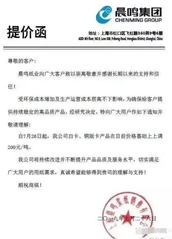 上海晨鳴漿紙:受環保成本增加及生產運營成本居高不下影響,為確保給客戶提供持續穩定的高品質產品,經研究決定,特向廣大用戶作如下通知并敬請理解:自7月26日起,我公司白卡、銅版卡產品在目前價格基礎上上調200元/噸。