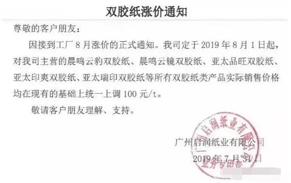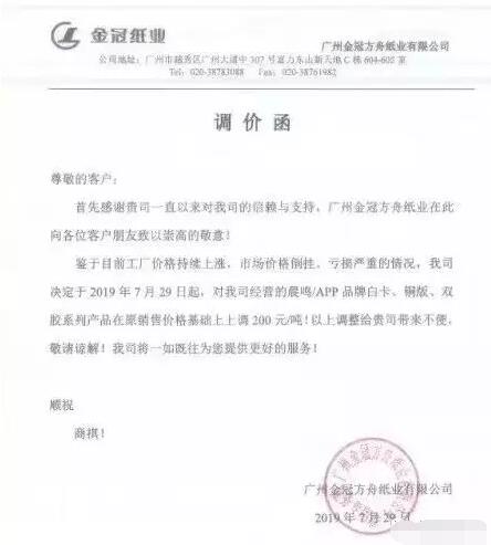廣州啟潤紙業:因接到工廠下月漲價200元/t的正式通知,定于2019年8月1日起,對我司主營的湛江晨鳴、麗致、APP金蝶蘭、帝王松、博匯丹頂鶴白卡、銅卡等所有白卡類產品實際銷售價格均在現有的基礎上統一上調200元/噸。