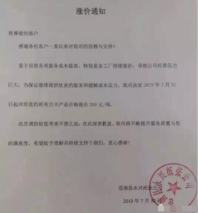 蒼南縣永興紙業:鑒于目前各項服務成本提高,特別是各工廠持續漲價,決定2019年7月31日起對經營的所有白卡產品價格漲價200元/噸。
