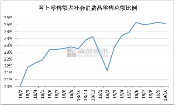 我們從近兩年國內(nèi)網(wǎng)絡(luò)銷售額與社會消費品零售總額的占比看,現(xiàn)在網(wǎng)絡(luò)消費占比在不斷攀升。國家統(tǒng)計局公布的10月網(wǎng)絡(luò)消費數(shù)據(jù)顯示,2019年1-10月份,全國網(wǎng)上零售額82307億元,同比增長16.4%。其中,實物商品網(wǎng)上零售額65172億元,增長19.8%,占社會消費品零售總額的比重為19.5%;在實物商品網(wǎng)上零售額中,吃、穿和用類商品分別增長34.8%、7.1%和16.6%。預(yù)計11月份,該比例還會有大幅的上升。