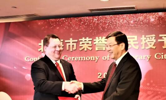 12月4日下午,斯道拉恩索集團消費紙板中國區高級副總裁葉萬霆(Pentti Ilmasti)因對北海市經濟及社會的突出貢獻被授予“北海市榮譽市民”稱號。授予儀式在北海香格里拉大酒店舉行。北海市市長蔡錦軍出席儀式,并向葉萬霆頒發“北海市榮譽市民”證書。