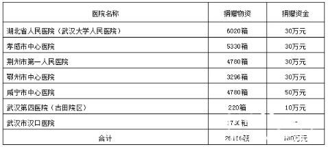 其中,200萬元現金由四川省紅十字會統籌安排,用于四川省新型冠狀病毒的防控防治一線的醫院、醫護人員和急需物資;308萬元的抗疫物資和現金用于疫情最為嚴重、抗疫一線的湖北省七家醫院,具體安排如下: