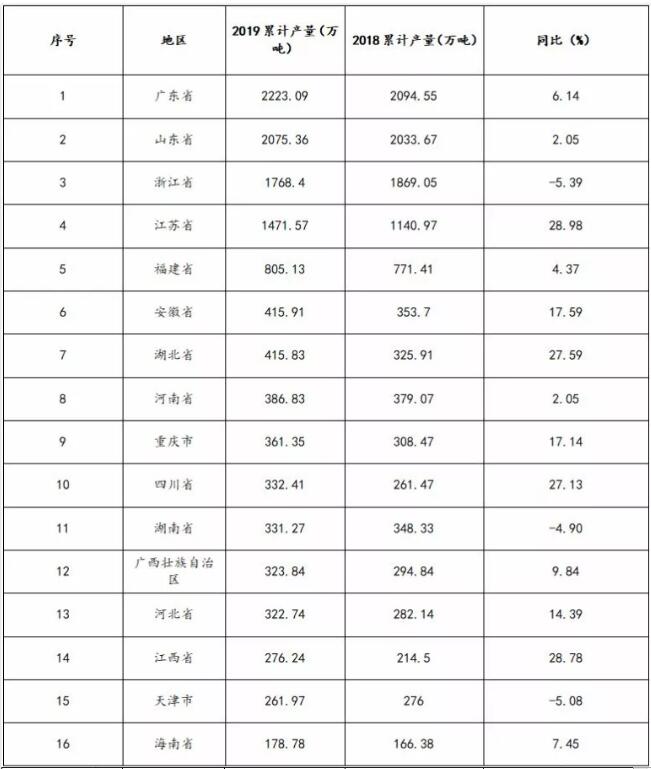 國內(nèi)造紙及紙制品業(yè)主要集中于沿海地區(qū),以2019年的數(shù)據(jù)為例,全國機制紙及紙板產(chǎn)量突破1.2億噸,排名前四的省份分別是廣東、浙江、江蘇、山東,占據(jù)總產(chǎn)量的60%。其中,廣東省實現(xiàn)產(chǎn)量2223.09萬噸,同比增長6.14%,排名全國第一。