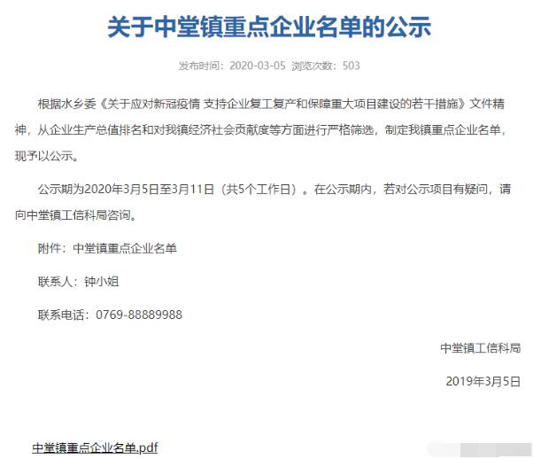 (2019年各省紙及紙板產(chǎn)量) 而廣東的造紙產(chǎn)能以東莞市居多,東莞市的造紙產(chǎn)能又以中堂鎮(zhèn)居多。2017年,東莞市中堂鎮(zhèn)有規(guī)模以上造紙企業(yè)13家,紙品加工企業(yè)15家。其中造紙企業(yè)年產(chǎn)量達500多萬噸,占東莞市造紙產(chǎn)量近50%,占全省造紙總產(chǎn)量的三分之一。 2018年,中堂鎮(zhèn)基地造紙產(chǎn)能由原規(guī)劃環(huán)評批復的年產(chǎn)量432.36萬噸調(diào)整到630萬噸,遠期不再預留擴產(chǎn)。這也意味著,中堂鎮(zhèn)理論上的造紙產(chǎn)能最多可增加到達到630萬噸。 為應對新冠疫情,支持企業(yè)復工復產(chǎn),2020年3月5日,中堂鎮(zhèn)公布了重點企業(yè)名單,其中造紙、紙品企業(yè)仍占據(jù)了較大比重。通知如下: 根據(jù)水鄉(xiāng)委《關于應對新冠疫情支持企業(yè)復工復產(chǎn)和保障重大項目建設的若干措施》文件精神,從企業(yè)生產(chǎn)總值排名和對我鎮(zhèn)經(jīng)濟社會貢獻度等方面進行嚴格篩選,制定我鎮(zhèn)重點企業(yè)名單,現(xiàn)予以公示。 公示期為2020年3月5日至3月11日(共5個工作日)。在公示期內(nèi),若對公示項目有疑問,請向中堂鎮(zhèn)工信科局咨詢。 附件:中堂鎮(zhèn)重點企業(yè)名單 中堂鎮(zhèn)工信科局 2019年3月5日