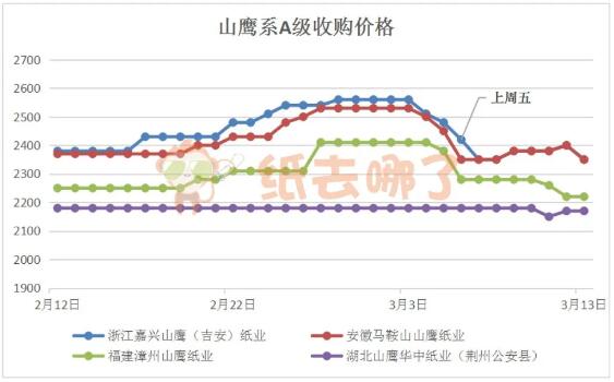 上周,廢紙價格“大跳水”,降價的范圍、幅度越來越大,甚至出現一日多次降價的情況。幾家大廠更是一馬當先,領頭降價。截至3月13日(上周五)上午,廢紙價格指數為2013.00點,相比前一周周五的2055.39點,下跌42.39點。 02、山鷹系A級收購價格走勢