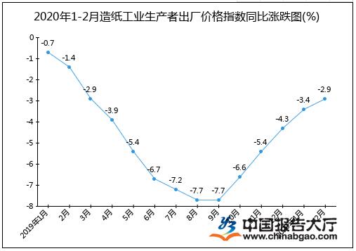 2020年1-2月造紙工業(yè)生產(chǎn)者出廠價(jià)格指數(shù)同比漲跌圖(%)附表: