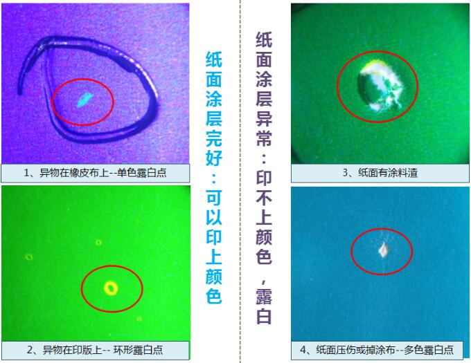 圖5:分切機牽引輥易黏附異物造成周期性壓傷 所以,不同的分切機分切質量會存在一定的差異性,不同松厚度的紙張分切適性也會存在差異,客戶應根據自己的設備性能、紙種搭配做好分切規劃、設備保養及分切品質檢查。 在此還需說明的一點是,如果使用平切機(即切紙機)修邊或規格切小,應注意平切后的端面紙毛紙屑情況,發現問題應及時調整或更換刀具,包括壓力的調整,切刀及膠條的更換。另外,平切時應注意觀察紙垛最上面一張紙的紙面,如發現有較多紙毛紙屑,應及時將其移除或拿掉。平切機周邊在使用風扇時,注意不要對著紙垛橫向吹風。 04、紙毛紙屑在不同位置導致的不同掉點形態 在印刷過程中,紙張直接與橡皮布接觸,不與印版接觸。由于橡皮布又與印版直接接觸,加上油墨的粘性,所以紙張上的紙毛紙屑,大部分先轉移到橡皮布上,進而轉移到印版、甚至膠輥上。下面讓我們來看一看,當紙毛紙屑在橡皮布及印版上時,所表現的不同印刷掉點形態,參考下圖。