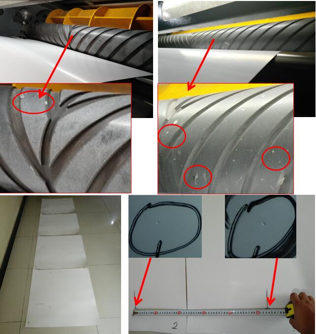 圖4:分切時切邊的紙毛紙屑很容易帶到紙張中間 另一個需要關注的是分切壓傷,最容易造成壓傷的是分切機牽引輥,因不同廠家機臺配置輥徑略有差異,通常周長在48-53cm不等,會造成周期性的重復壓傷問題。