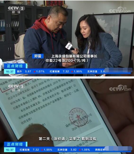上海奉其奉包裝印刷科技有限公司董事長徐龍平:漲上來的時候,我們拿的紙全用到我們用戶那里去了。用戶有一個周轉(zhuǎn)期漲價,然而到用戶允許漲價的時候,可是市場已經(jīng)跌了。所以這個時候,用戶會提出不漲價,導致我們買進的原紙和銷售出去的價格是倒掛的。 上海永盛包裝有限公司董事長鄭雷:你長期的話,哪怕再虧也好,價格沒有確定之前,你都要保證供貨,保證為客戶服務。