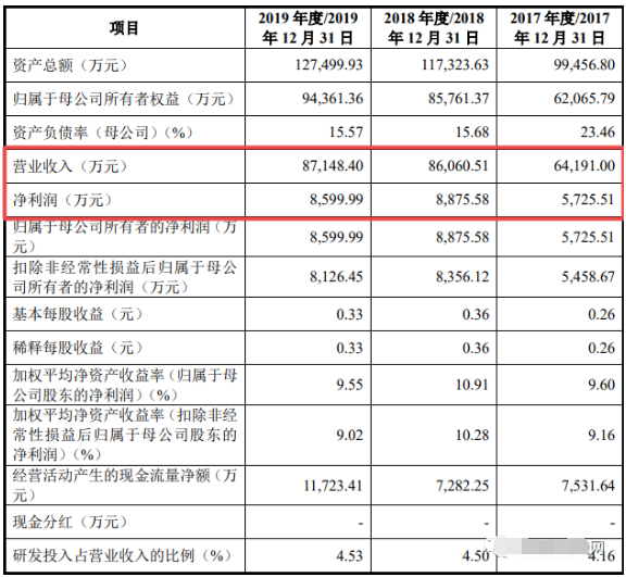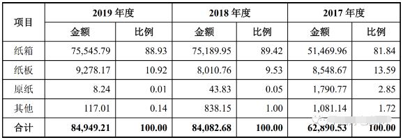 (龍利得2019年前十大客戶情況單位:萬(wàn)元) 2019年主營(yíng)業(yè)務(wù)收入達(dá)8.49億 近三年來(lái),龍利得主營(yíng)業(yè)務(wù)收入整體呈現(xiàn)出上升趨勢(shì),2017-2019年分別為6.29億元、8.41億元、8.49億元。在產(chǎn)品結(jié)構(gòu)上,紙箱業(yè)務(wù)的營(yíng)收占比在80%以上,且正在逐步上升,紙板、原紙及其他業(yè)務(wù)占總營(yíng)收的比例逐步減小。 以最近的2019年為例,在龍利得8.49億元的主營(yíng)業(yè)務(wù)收入中,有7.55億元來(lái)自紙箱產(chǎn)品,占比達(dá)88.93%;紙板產(chǎn)品帶來(lái)的營(yíng)收為9278.17萬(wàn)元,占比10.92%。而原紙及其他產(chǎn)品占比較小,營(yíng)收分別為8.24萬(wàn)元、117.01萬(wàn)元。