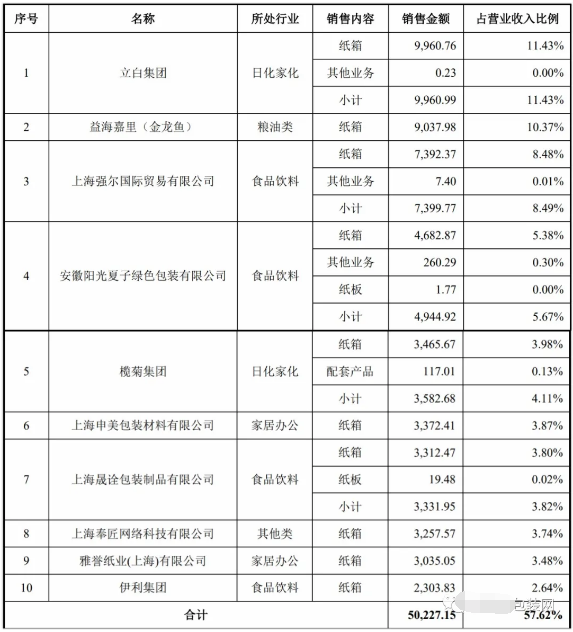 (龍利得近三年的主要財(cái)務(wù)數(shù)據(jù)和財(cái)務(wù)指標(biāo)) 在客戶方面,龍利得主要為食品飲料、日化家化、糧油、家居辦公、電子器械、醫(yī)藥醫(yī)療等行業(yè)的客戶提供包裝產(chǎn)品和服務(wù),可根據(jù)客戶的需求量身定制、設(shè)計(jì)綜合包裝方案。在2019年,龍利得前十大客戶包括立白、益海嘉里(金龍魚)、欖菊、伊利等知名終端企業(yè)。 2019年的前十大客戶為龍利得貢獻(xiàn)了5.02億元營(yíng)收,占總營(yíng)收的57.62%。值得一提的是,在這10家客戶中,還有部分包裝企業(yè)。這或許是因?yàn)椴糠旨埾淦髽I(yè)需采購(gòu)龍利得的紙板產(chǎn)品用于生產(chǎn)紙箱。同時(shí),還有部分企業(yè)采購(gòu)龍利得生產(chǎn)的紙箱直接對(duì)外出售。