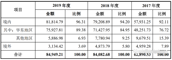 (龍利得主營(yíng)業(yè)務(wù)收入構(gòu)成情況單位:萬(wàn)元,%) 在價(jià)格方面,龍利得的紙板、紙箱銷售單價(jià)與原紙的價(jià)格走勢(shì)基本一致。2018年,隨著原紙價(jià)格上漲,龍利得紙箱價(jià)格上升至3.45元/平方米、紙板價(jià)格上升至為3.16元/平方米;2019年,原紙市場(chǎng)價(jià)格有所下滑,龍利得紙箱、紙板價(jià)格分別回落至3.08元/平方米、3.03元/平方米。 目前,龍利得國(guó)內(nèi)銷售主要集中在華東地區(qū),2019年產(chǎn)生的營(yíng)收為7.59億元,而其余地區(qū)產(chǎn)生的營(yíng)收為則5886.98萬(wàn)元。此外,龍利得境外銷售為3134.42萬(wàn)元,主要為美國(guó)、澳大利亞、加拿大等國(guó)家及地區(qū)。