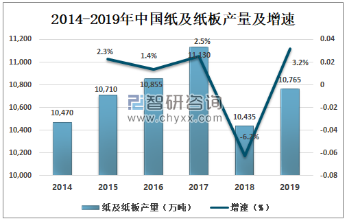 一、概況 新聞紙又稱白報紙,是報刊及書籍的主要用紙。適用于報紙、期刊、課本、連環(huán)畫等正文用紙。新聞紙的特點(diǎn)有:紙質(zhì)松輕、有較好的彈性;吸墨性能好,這就保證了油墨能較好地固著在紙面上。 含有大量的木質(zhì)素和其他雜質(zhì),不宜長期存放。保存時間過長,紙張會發(fā)黃變脆,抗水性能差,不宜書寫等。必須使用印報油墨或書籍油墨,油墨粘度不要過高,平版印刷時必須嚴(yán)格控制版面水分。由于其所用原材料以機(jī)械木漿為主,含有本質(zhì)素及雜質(zhì),所以紙張不宜長期保存,而且容易破損。2019年中國紙及紙板產(chǎn)量為10765萬噸,同比增加3.2%,其中新聞紙占比1.39%。 2014-2019年中國紙基紙板產(chǎn)量及增速