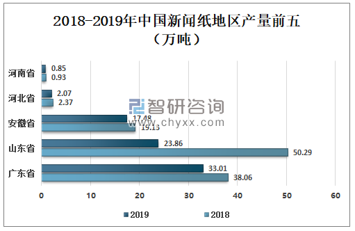 數(shù)據(jù)來源:中國造紙協(xié)會、智研咨詢整理 新聞紙是報刊及書籍的主要用紙,近年來,電子媒體盛行,報紙用紙量減少,新聞紙產(chǎn)量不復(fù)以往。2019年中國新聞紙地區(qū)產(chǎn)量排名第一帶的為廣東省38.06萬噸,第二名新聞紙產(chǎn)量為山東省23.86萬噸,第三名依舊是安徽省為17.48萬噸。 2018-2019年中國新聞紙地區(qū)產(chǎn)量前五