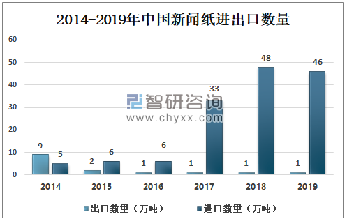 數(shù)據(jù)來源:國家統(tǒng)計局、智研咨詢整理 2、進(jìn)出口情況 由于下游市場萎靡,我國新聞紙產(chǎn)量下滑,大量產(chǎn)能退出,但剛性需求仍然存在,使得我國新聞紙進(jìn)口量大幅增長以彌補(bǔ)空缺。2019年,我國新聞紙進(jìn)口量達(dá)到46萬噸,為2010年的10倍有余。 與進(jìn)口量變化情況相反,我國新聞紙出口量近年來大幅下降。2019年,我國新聞紙出口量僅為1萬噸,與2010年的11萬噸相去甚遠(yuǎn)。 2014-2019年中國新聞紙進(jìn)出口數(shù)量