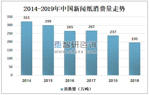 數(shù)據(jù)來源:中國海關(guān)、智研咨詢整理 3、市場需求 受下游市場消極影響,新聞紙消費(fèi)量逐年下滑,但下滑速度較產(chǎn)量下滑速度慢,整體消費(fèi)量較產(chǎn)量更高,新聞紙國內(nèi)市場出現(xiàn)輕微的供不應(yīng)求狀態(tài)。2018年,多家報刊停刊停辦,再加上由于報業(yè)廣告經(jīng)營的下滑以及發(fā)行量下降等因素,報紙出現(xiàn)減張、縮版、減量的情況,致使報業(yè)新聞紙采購量繼續(xù)下降。2019年我國新聞紙消費(fèi)量達(dá)到195萬噸,較2018年下滑17.72%,但較2019年產(chǎn)量多出30%。 2014-2019年中國新聞紙消費(fèi)量走勢