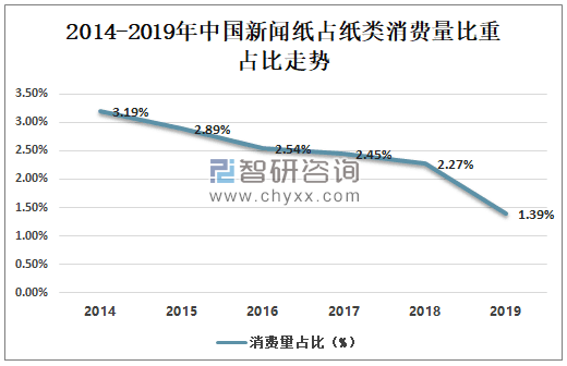 數(shù)據(jù)來源:中國造紙協(xié)會、智研咨詢整理 面對報紙用紙量減少,新聞紙市場供大于求,消費(fèi)量一路走低。從2014年開始至今,新聞紙消費(fèi)量占比下滑,到2019年消費(fèi)量占比為1.39%。比去年消費(fèi)量占比幅度減少較大。 2014-2019年中國新聞紙消費(fèi)量占比走勢