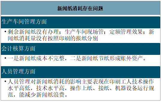 數(shù)據(jù)來源:智研咨詢整理 三、新聞紙消耗存在問題及解決方式 印刷結(jié)束后剩余新聞紙沒有辦理退庫,以新聞紙出庫量作為實(shí)際消耗量.虛增了新聞紙消耗量,易造成浪費(fèi)。 隨意印前領(lǐng)用的新聞紙由物資部提前擺放到生產(chǎn)車間、剩余新聞紙也在生產(chǎn)車間存放,生產(chǎn)車間現(xiàn)場管理的標(biāo)準(zhǔn)寬松,或者標(biāo)準(zhǔn)執(zhí)行不嚴(yán)格,地面臟亂衛(wèi)生沒有及時打掃、人員隨意進(jìn)出等,很容易造成新聞紙外皮刮擦等,形成廢紙,虛增新聞紙消耗量。 定額管理有效與否關(guān)鍵在于定額是否合理,定額制訂是需要多部門博弈、協(xié)商,受多個因素的影響.例如印量、新聞紙質(zhì)量、人員技能水平的不同都會影響定額。 新聞紙消耗存在問題