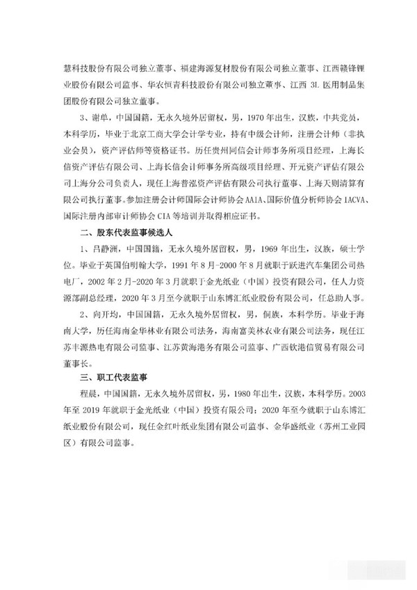 鑒于山東博匯紙業(yè)股份有限公司(以下簡稱“公司”)間接控股股東已變更為金光紙業(yè)(中國)投資有限公司(以下簡稱“金光紙業(yè)”),公司董事會、監(jiān)事會擬提前進行換屆。