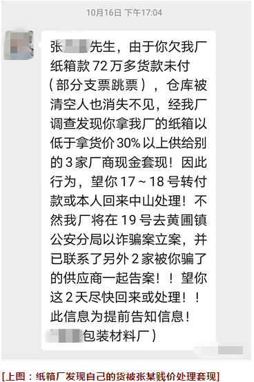 導 語 : 兩人合伙創辦空殼公司,按照市場價訂購紙箱再以低于市場價賣出,靠著高買低賣紙箱的“神操作”,套得巨額貨款,非法所得大多用于賭博,搞得好幾家紙箱廠被騙。近日,廣東省中山市小欖鎮警方成功破獲這起詐騙案。 好幾家紙箱廠貨款被騙 近日,小欖警方成功破獲一起詐騙案,其中一名事主被詐騙77萬余元。辦案民警在貴州將犯罪嫌疑人成功抓獲。 今年5月底,一名張姓男子向小欖鎮某紙箱廠下一批燈具的包裝紙箱訂單。張某對單價并不太在意,但要求貨款次月結清。6月訂單交付后,張某立即下定7月和8月的訂單,而且每月訂單成倍上漲。