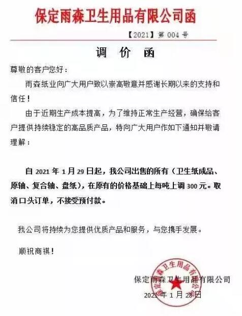 晨鳴集團(tuán):自2021年1月31日起,我司生活用紙?jiān)埫繃嵦醿r(jià)200元/噸;自2021年2月18日起,我司生活用紙?jiān)埫繃嵦醿r(jià)300元/噸;