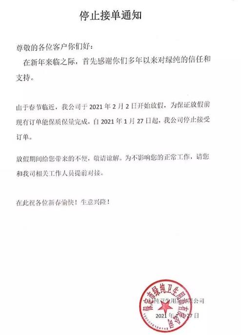 河北金博士衛(wèi)生用品:自2021年1月28日起,白色復(fù)卷用軸(含高濕強(qiáng))上調(diào)300元/噸;面巾用軸上調(diào)300元/噸;本色復(fù)卷用軸上調(diào)300元/噸,本色面巾用軸上調(diào)300元/噸。