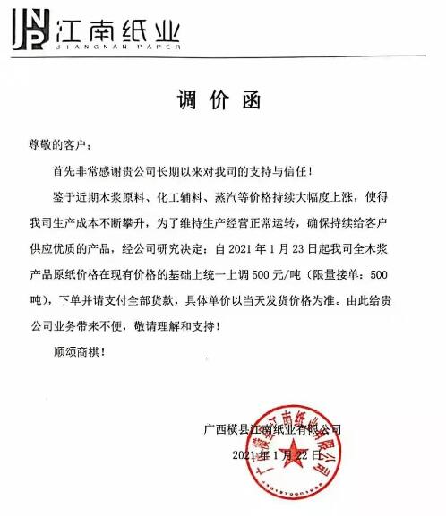 維爾美紙業(yè)(重慶)有限公司:自2021年2月18日起,在2月1日的價(jià)格政策基礎(chǔ)上調(diào)400元/噸;自2021年3月1日起,在2月18日的價(jià)格政策基礎(chǔ)上調(diào)400元/噸;